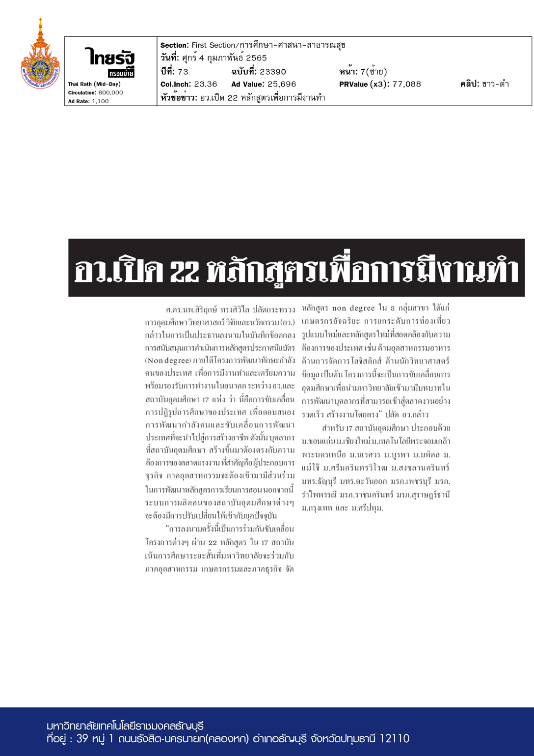 “การลงนามครั้งนี้เป็นการร่วมกันขับเคลื่อนโครงการต่างๆ ผ่าน 22 หลักสูตร ใน 17 สถาบัน เน้นการศึกษาระยะสั้น ที่มหาวิทยาลัยจะร่วมกับภาคอุตสาหกรรม เกษตรกรรมและภาคธุรกิจ จัดหลักสูตร non degree ใน 3 กลุ่มสาขา ได้แก่ เกษตรกรอัจฉริยะ การยกระดับการท่องเที่ยวรูปแบบใหม่และหลักสูตรใหม่ที่สอดคล้องกับความต้องการของประเทศ เช่น ด้านอุตสาหกรรมอาหาร ด้านการจัดการโลจิสติกส์ ด้านนักวิทยาศาสตร์ข้อมูล เป็นต้น โครงการนี้จะเป็นการขับเคลื่อนการอุดมศึกษาเพื่อนำมหาวิทยาลัยเข้ามามีบทบาทในการพัฒนาบุคลากรที่สามารถเข้าสู่ตลาดงานอย่างรวดเร็ว สร้างงานโดยตรง” ปลัด อว.กล่าว
