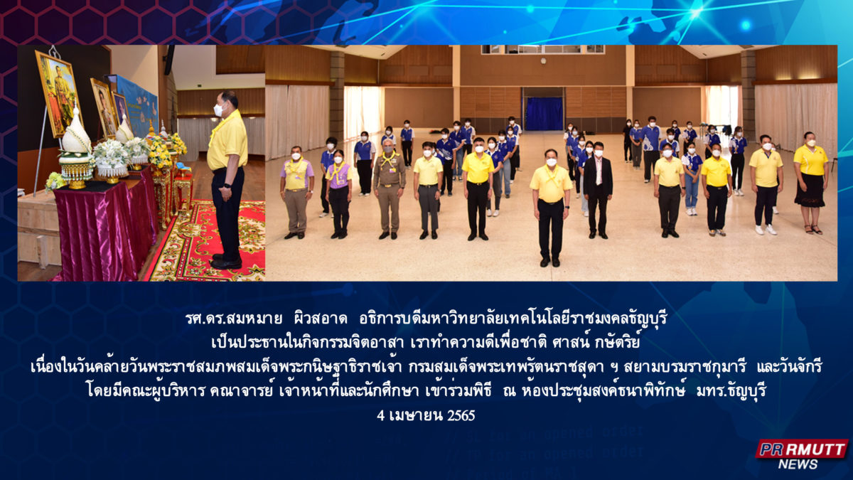 รศ.ดร.สมหมาย ผิวสอาด อธิการบดีมหาวิทยาลัยเทคโนโลยีราชมงคลธัญบุรี เป็นประธานในกิจกรรมจิตอาสา เราทำความดีเพื่อชาติ ศาสน์ กษัตริย์ เนื่องในวันคล้ายวันพระราชสมภพสมเด็จพระกนิษฐาธิราชเจ้า กรมสมเด็จพระเทพรัตนราชสุดา ฯ สยามบรมราชกุมารี และวันจักรี โดยมีคณะผู้บริหาร คณาจารย์ เจ้าหน้าที่และนักศึกษา เข้าร่วมพิธี ณ ห้องประชุมสงค์ธนาพิทักษ์ มทร.ธัญบุรี 4 เมษายน 2565