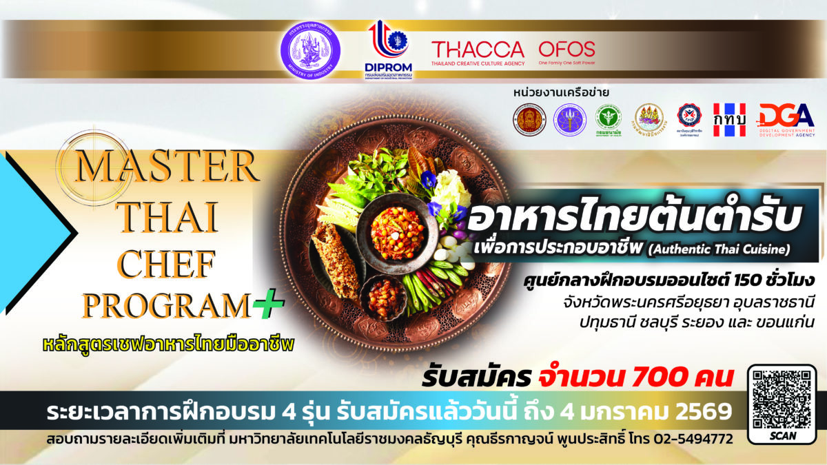 กรมส่งเสริมอุตสาหกรรม กระทรวงอุตสาหกรรม ร่วมกับมหาวิทยาลัยเทคโนโลยีราชมงคลธัญบุรี และสำนักงานกองทุนหมู่บ้านและชุมชนเมืองแห่งชาติ เดินหน้าขับเคลื่อน เป้าหมายการพัฒนาที่ยั่งยืน (SDGs) ผ่านการจัด หลักสูตรเชฟอาหารไทยมืออาชีพ (Master Thai Chef Program) – “อาหารไทยต้นตำรับเพื่อการประกอบอาชีพ (Authentic Thai Cuisine)” ภายใต้โครงการส่งเสริมซอฟต์พาวเวอร์สาขาอาหาร เพื่อสร้างงาน สร้างรายได้ และยกระดับเศรษฐกิจสร้างสรรค์ของประเทศ