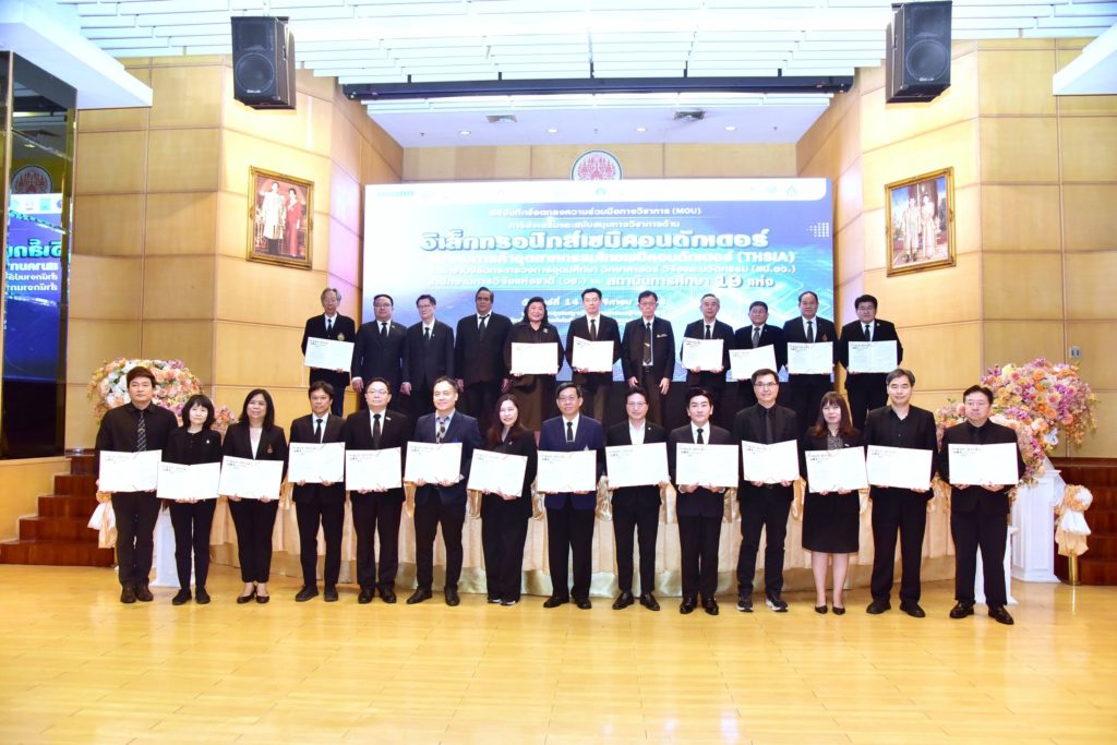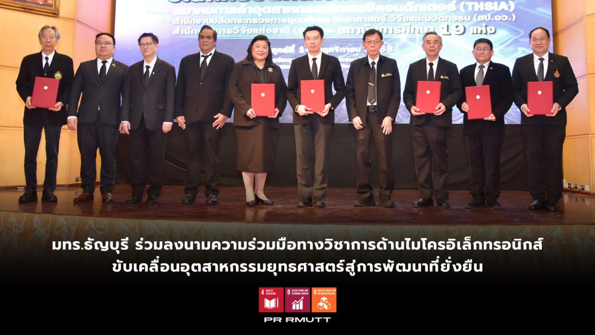วันที่ 14 พฤศจิกายน 2568 ณ หอประชุมเบญจรัตน์ มหาวิทยาลัยเทคโนโลยีพระจอมเกล้าพระนครเหนือ รศ.ดร.สมหมาย ผิวสอาด อธิการบดีมหาวิทยาลัยเทคโนโลยีราชมงคลธัญบุรี เข้าร่วมพิธีลงนามความร่วมมือทางวิชาการเพื่อส่งเสริมและสนับสนุนการพัฒนาบุคลากรด้าน ไมโครอิเล็กทรอนิกส์ ระหว่าง สมาคมการค้าอุตสาหกรรมไทยเซมิคอนดักเตอร์ กับ สำนักงานปลัดกระทรวงการอุดมศึกษา วิทยาศาสตร์ วิจัยและนวัตกรรม, สำนักงานการวิจัยแห่งชาติ (วช.) และเครือข่ายมหาวิทยาลัย 19 แห่ง โดยมี ศาสตราจารย์ ดร.ศุภชัย ปทุมนากุล ปลัดกระทรวงการอุดมศึกษา วิทยาศาสตร์ วิจัยและนวัตกรรม เป็นประธานในพิธี