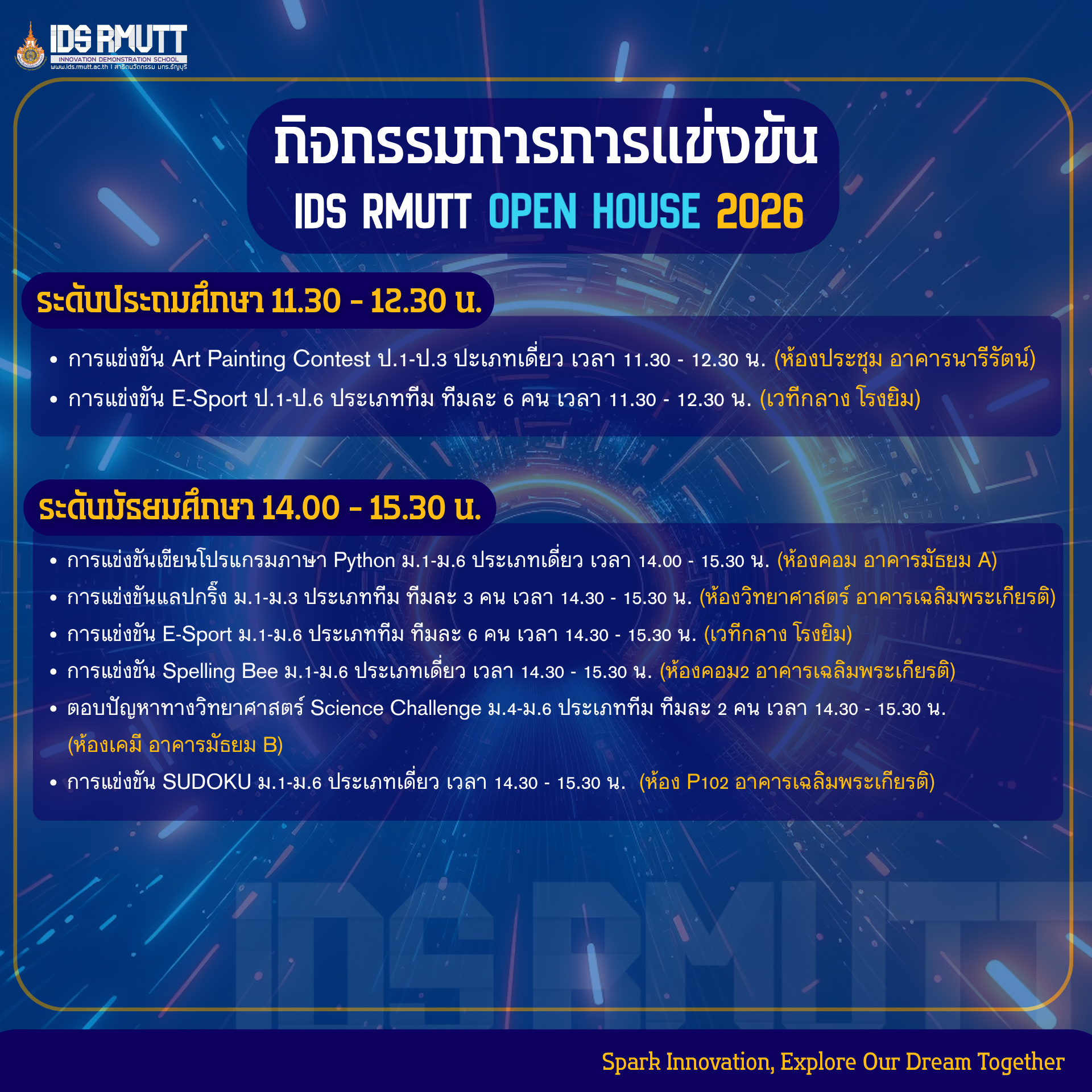 สำหรับผู้สนใจ สามารถดูรายละเอียดเพิ่มเติมและตรวจสอบกำหนดการฉบับเต็มได้จากภาพประชาสัมพันธ์บนเว็บไซต์โรงเรียนสาธิตนวัตกรรม มหาวิทยาลัยเทคโนโลยีราชมงคลธัญบุรี ดูรายละเอียดทั้งหมดได้ที่ >> https://ids.rmutt.ac.th/ids-rmutt-open-house-2026/