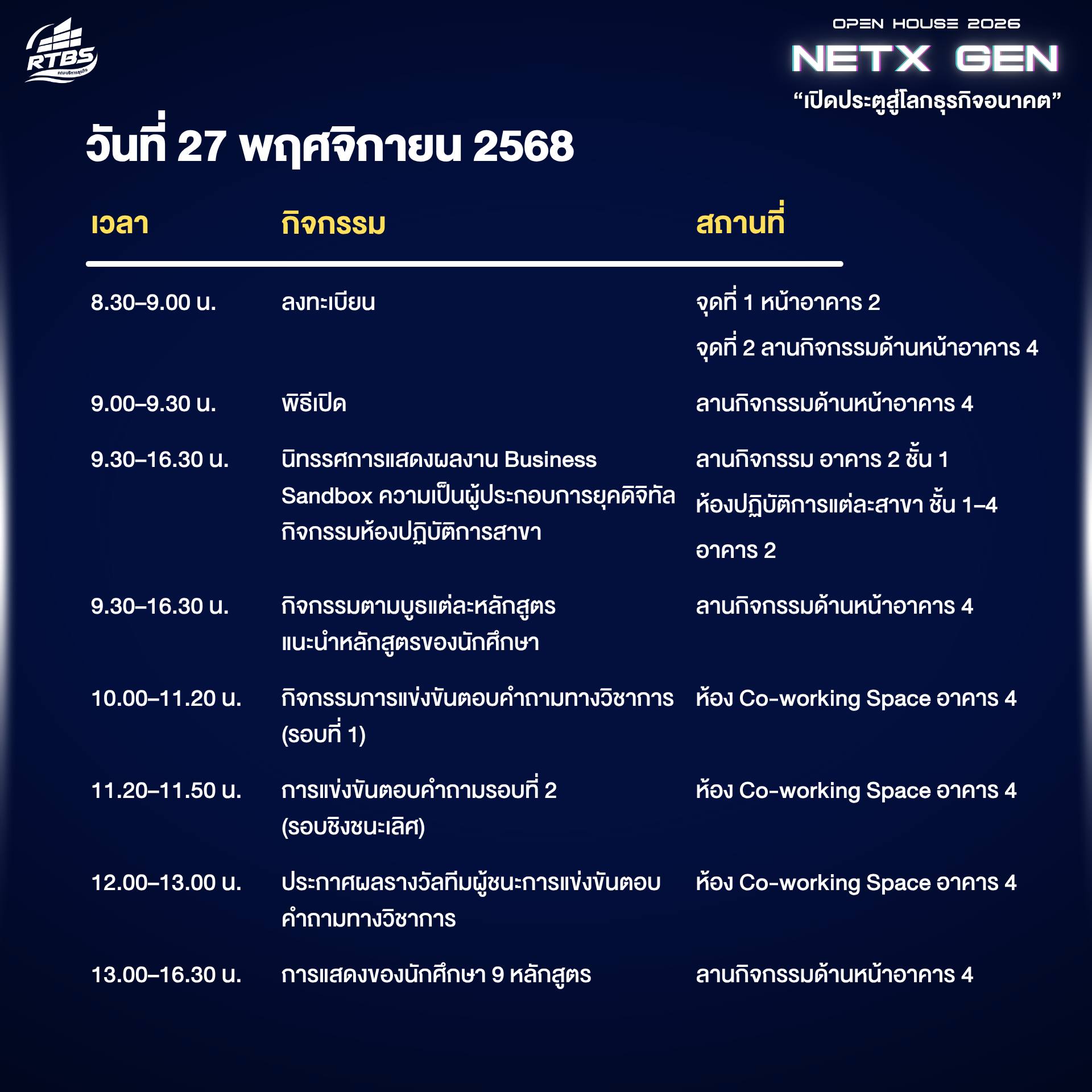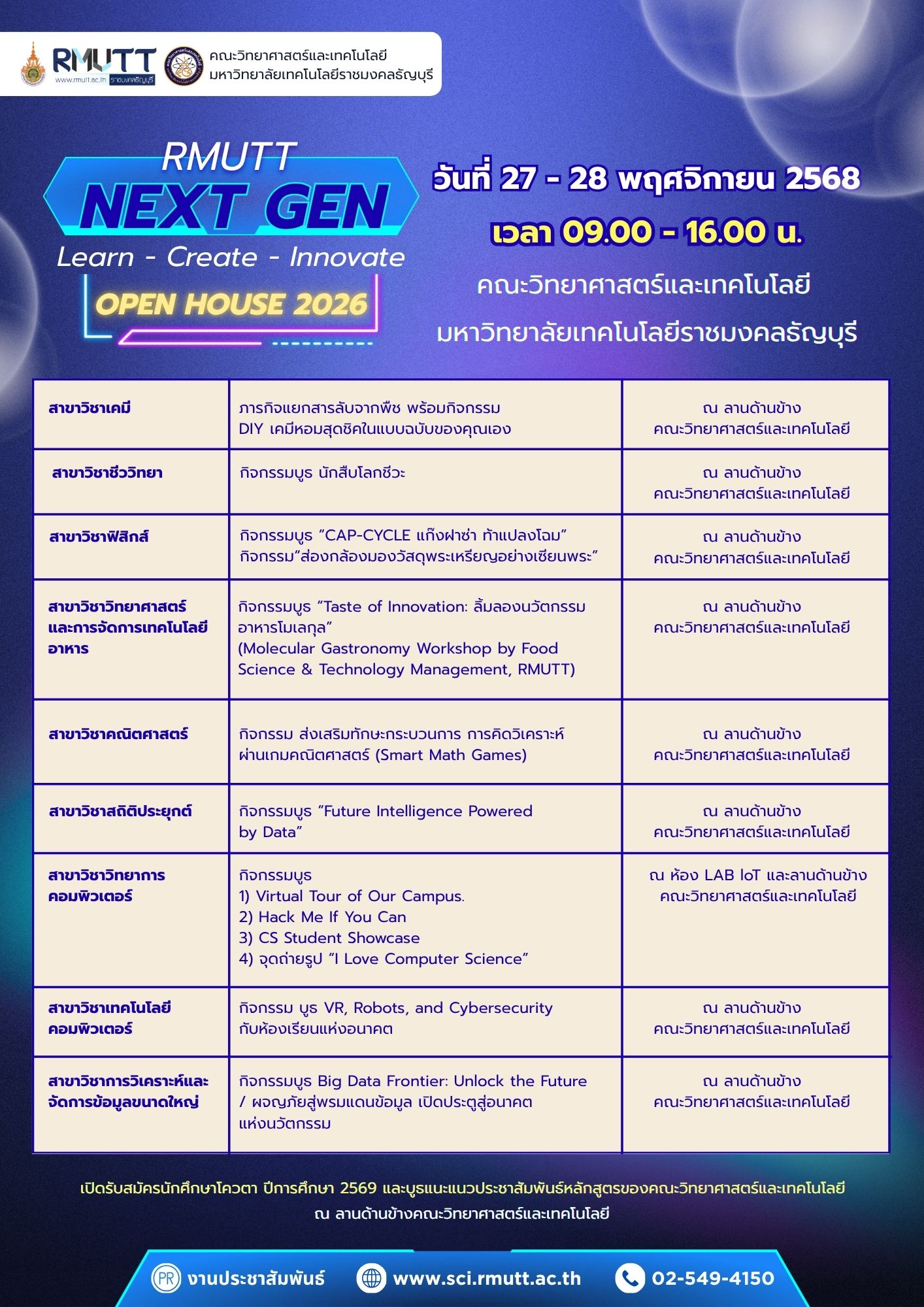 ดูรายละเอียดทั้งหมดได้ที่ >> https://sci.rmutt.ac.th/scinextgen-openhouse2026/