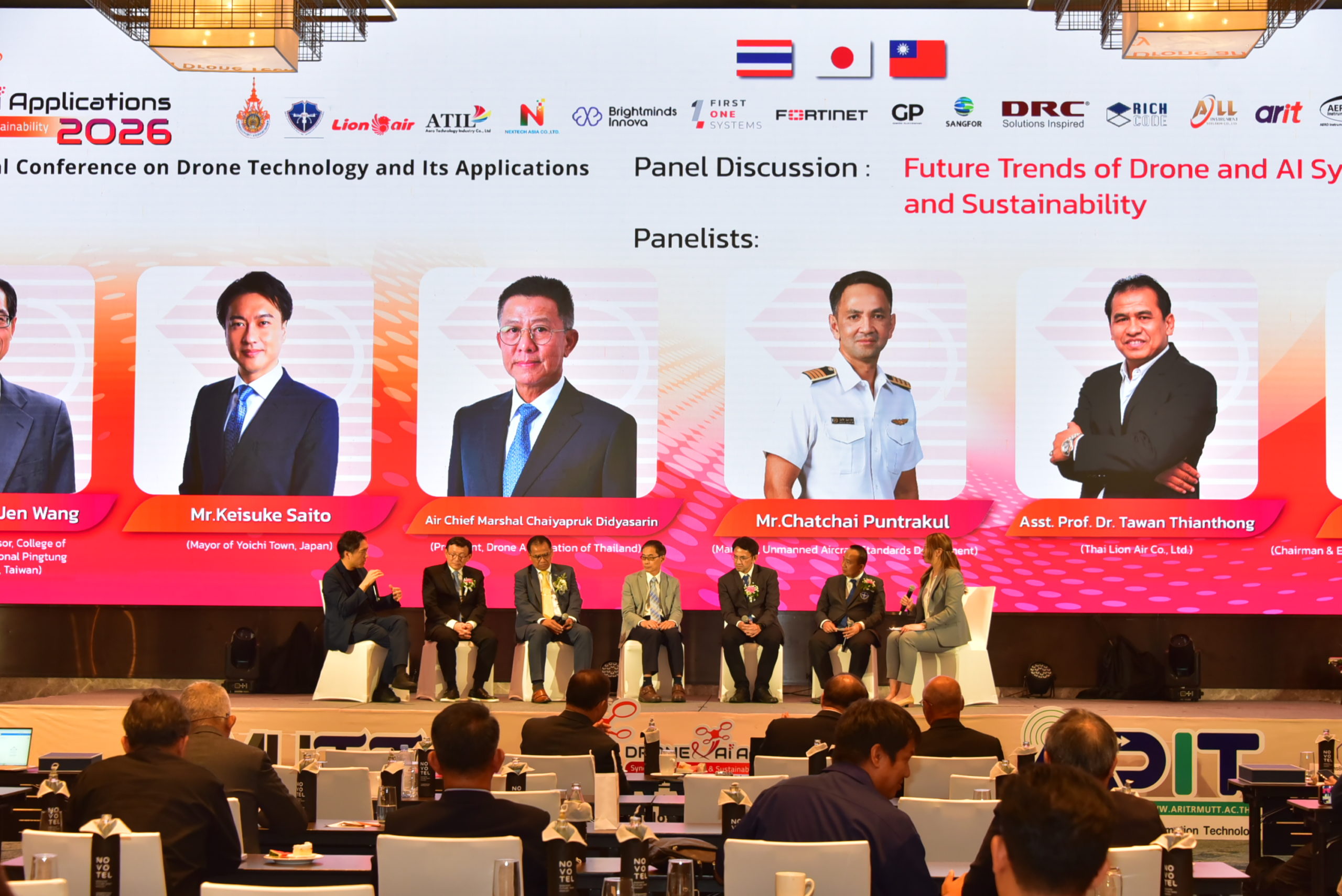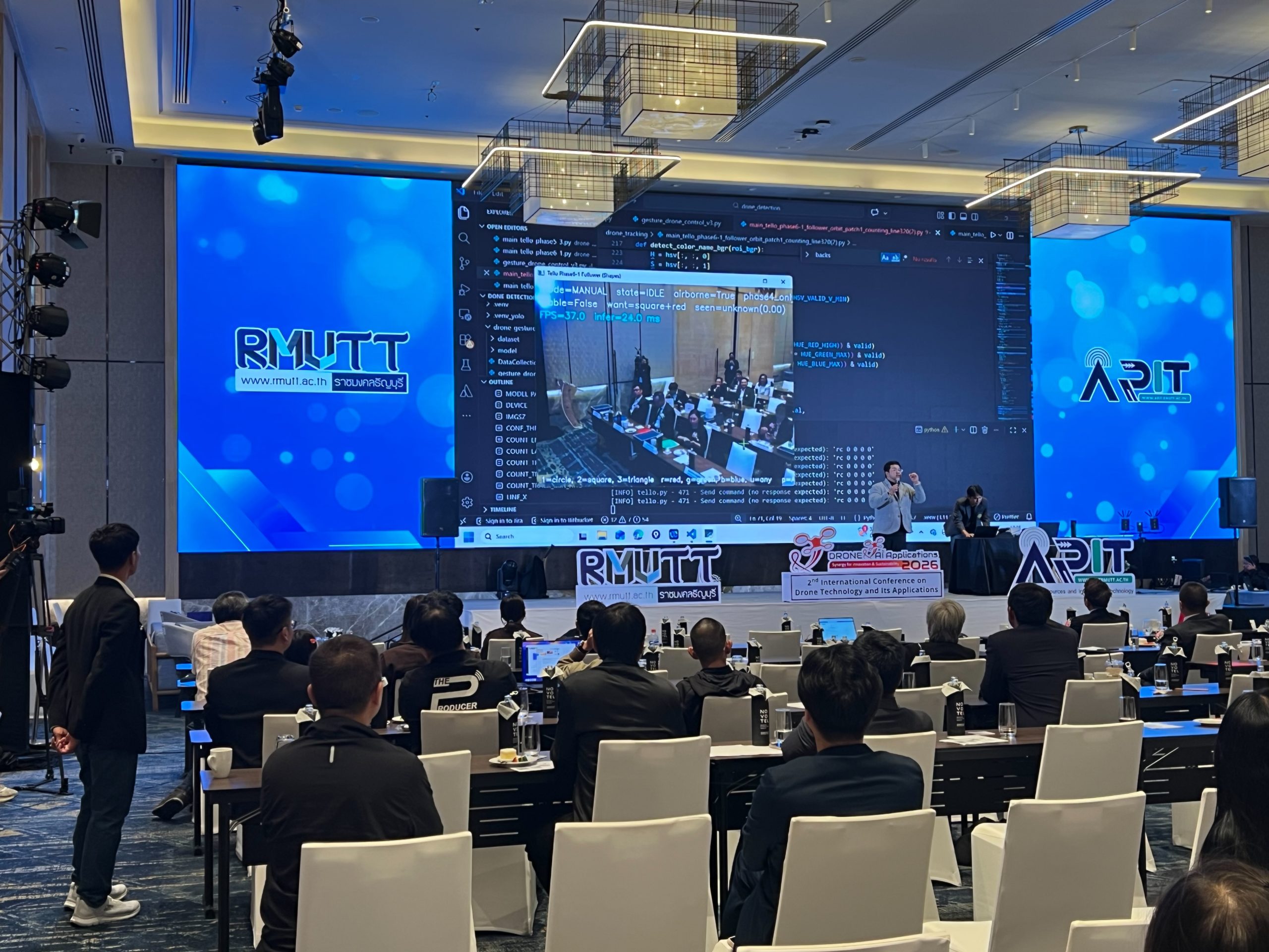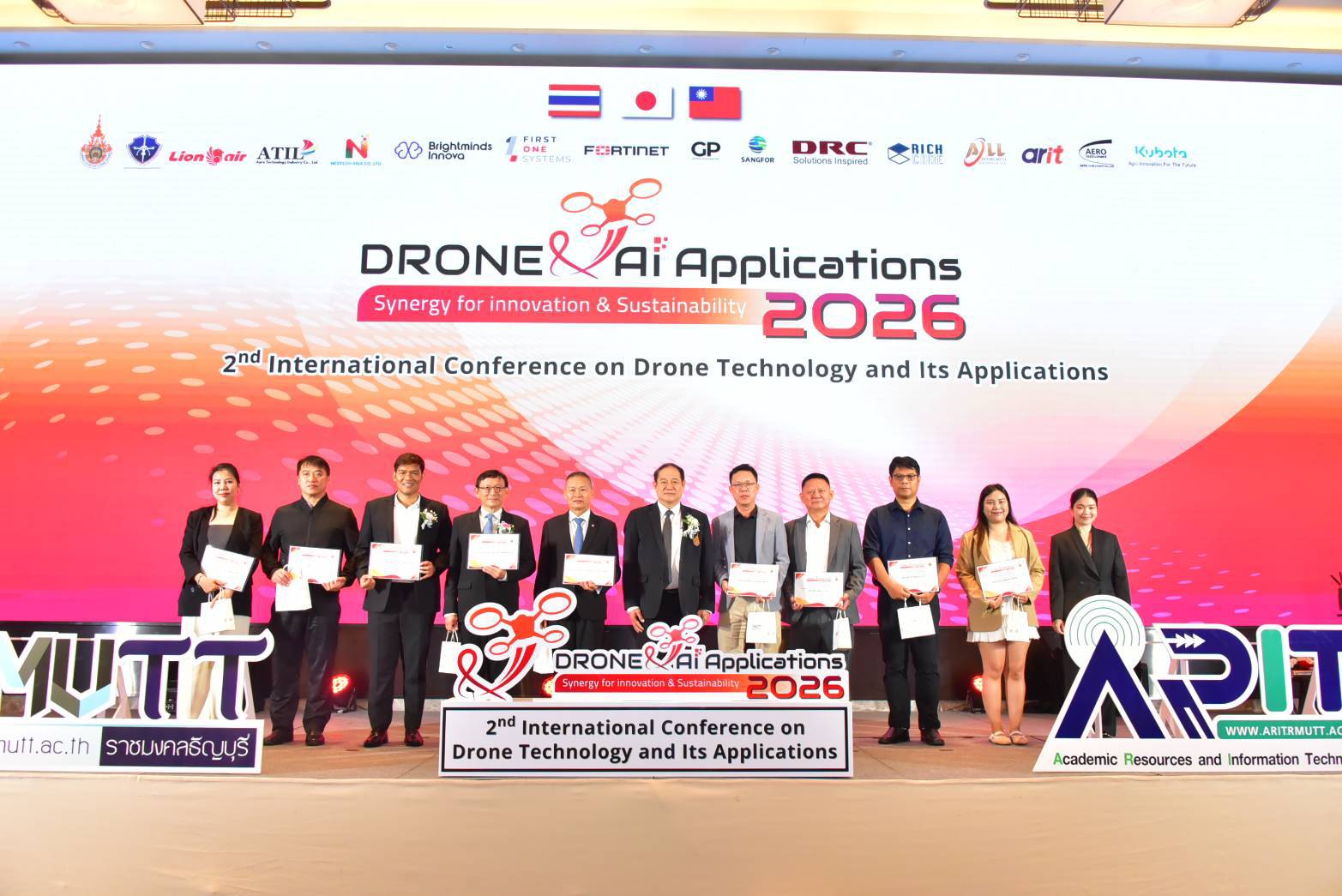 สำนักวิทยบริการและเทคโนโลยีสารสนเทศ มทร.ธัญบุรี เปิดฉากงานประชุมวิชาการระดับนานาชาติด้านเทคโนโลยีและนวัตกรรมอากาศยานไร้คนขับ ครั้งที่ 2 ภายใต้แนวคิดการผสานพลังโดรนและปัญญาประดิษฐ์ (AI) เพื่อสร้างสรรค์นวัตกรรมและความยั่งยืน มุ่งยกระดับขีดความสามารถของไทย ในเวทีโลกสอดรับยุทธศาสตร์ชาติและการเป็นมหาวิทยาลัยแห่งนวัตกรรม โดยมี รศ.ดร.สมหมาย ผิวสอาด อธิการบดีมหาวิทยาลัยเทคโนโลยีราชมงคลธัญบุรี (มทร.ธัญบุรี) เป็นประธานในพิธีเปิด และผศ.ณัชติพงศ์ อูทอง รองอธิการบดี เป็นผู้กล่าวรายงาน ซึ่งมี พลอากาศตรี ศาสตราจารย์ ดร.ประสงค์ ประณีตพลกรัง และดร. ถวัลย์ เทียนทอง ที่ปรึกษามหาวิทยาลัย รวมถึง รศ.ดร.สมเจตน์ ทิณพงษ์ อุปนายกสภามหาวิทยาลัย เข้าร่วม เมื่อวันที่ 26 กุมภาพันธ์ 2569 ณ โรงแรมโนโวเทล กรุงเทพ ฟิวเจอร์พาร์ค รังสิต จ.ปทุมธานี