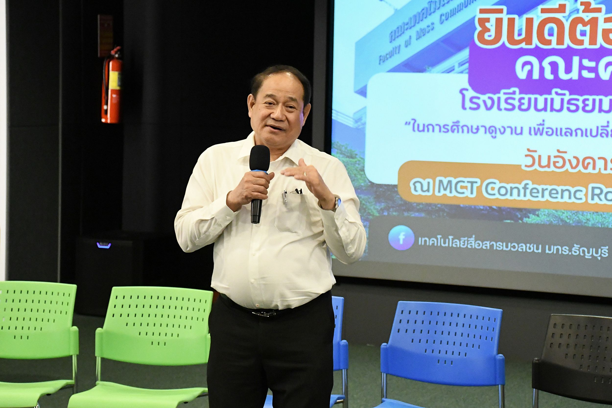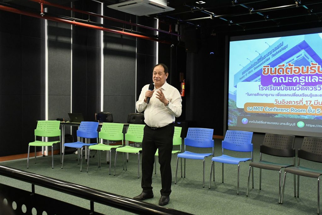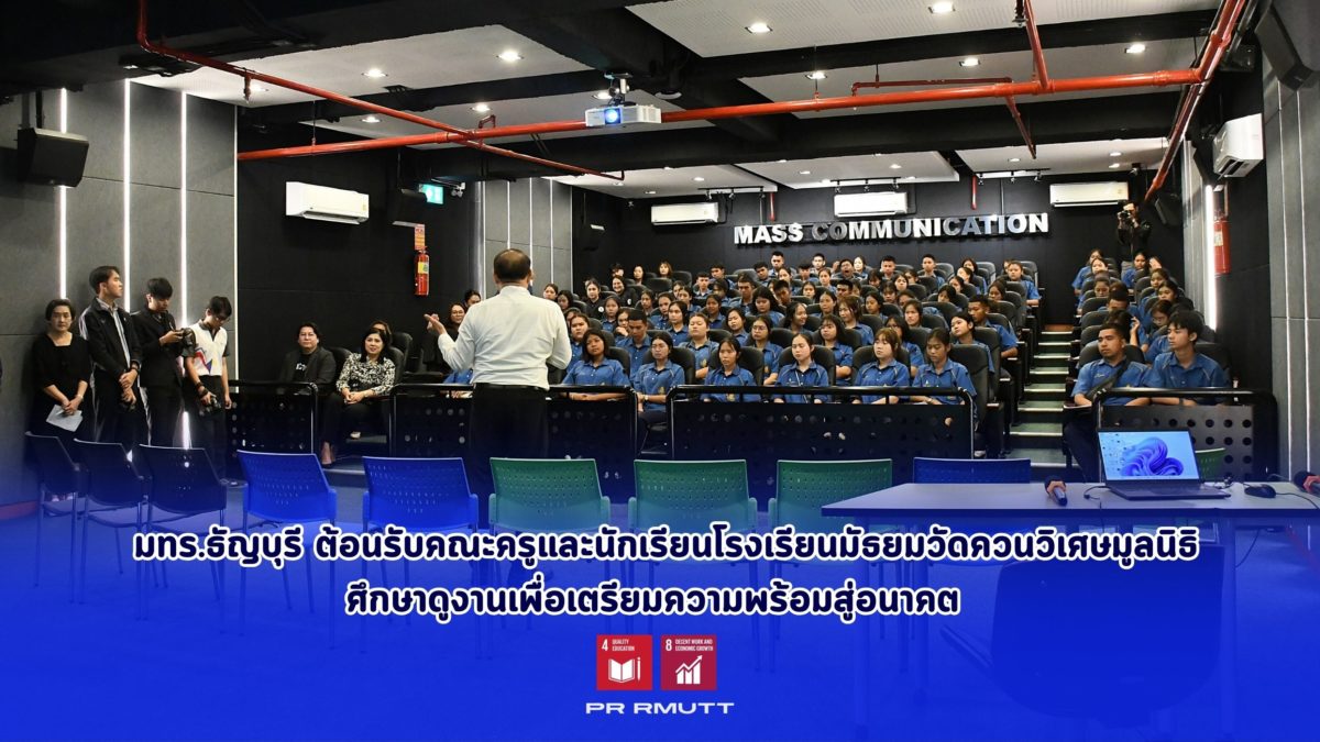 เมื่อวันที่ 17 มีนาคม 2569 ณ MCT Conference Room คณะเทคโนโลยีสื่อสารมวลชน มหาวิทยาลัยเทคโนโลยีราชมงคลธัญบุรี รศ.ดร.สมหมาย ผิวสอาด อธิการบดีมหาวิทยาลัย พร้อมด้วยผู้บริหาร ให้การต้อนรับคณะครูและนักเรียนจาก โรงเรียนมัธยมวัดควนวิเศษมูลนิธิ จังหวัดตรัง สังกัดสำนักงานคณะกรรมการส่งเสริมการศึกษาเอกชน ภายใต้การดูแลโรงเรียนการกุศลของวัดในพระพุทธศาสนา การศึกษาดูงานครั้งนี้จัดขึ้นเพื่อให้นักเรียนระดับมัธยมศึกษาตอนปลายได้ เตรียมความพร้อมในการวางแผนการศึกษาต่อ และ กำหนดเป้าหมายอาชีพในอนาคต ผ่านการเรียนรู้จาก ประสบการณ์ตรงของผู้เชี่ยวชาญ และการเยี่ยมชมสิ่งแวดล้อมการเรียนรู้ภายในมหาวิทยาลัย ซึ่งช่วยสร้างแรงบันดาลใจและเสริมทักษะการคิดวิเคราะห์เชิงอาชีพกิจกรรมดังกล่าวสะท้อนถึงความมุ่งมั่นของมหาวิทยาลัยในการสนับสนุน การศึกษาที่มีคุณภาพ (Quality Education) และการพัฒนาทักษะเยาวชนให้พร้อมเข้าสู่ตลาดแรงงานในอนาคตอย่างมีคุณค่าและยั่งยืน ซึ่งสอดคล้องกับ เป้าหมายการพัฒนาที่ยั่งยืน (SDGs)