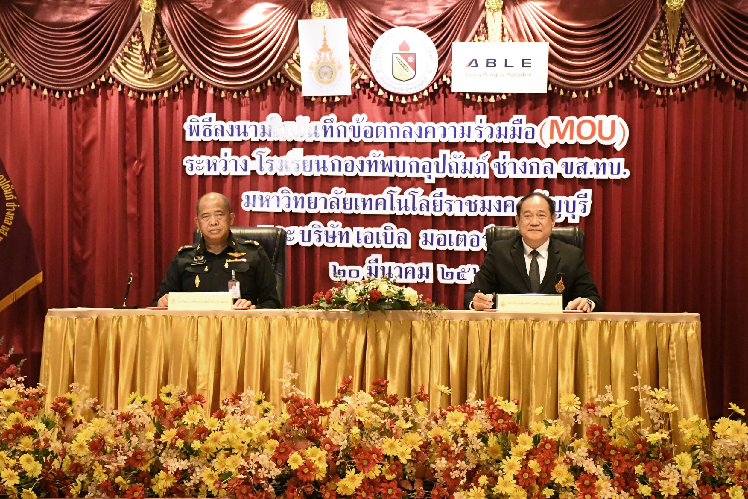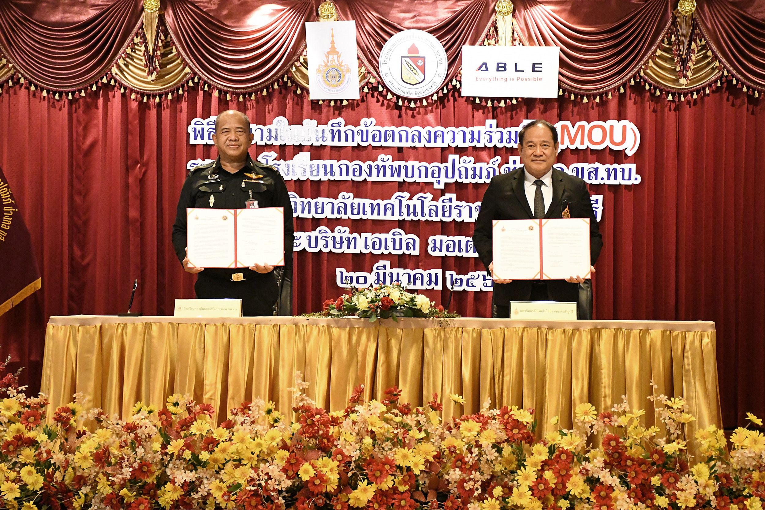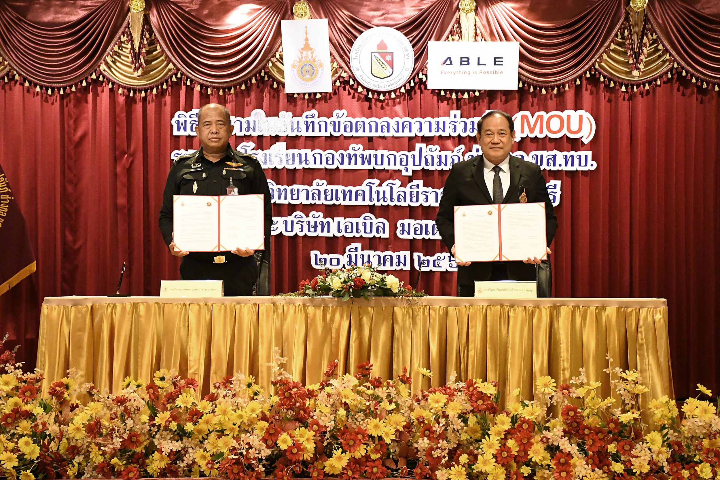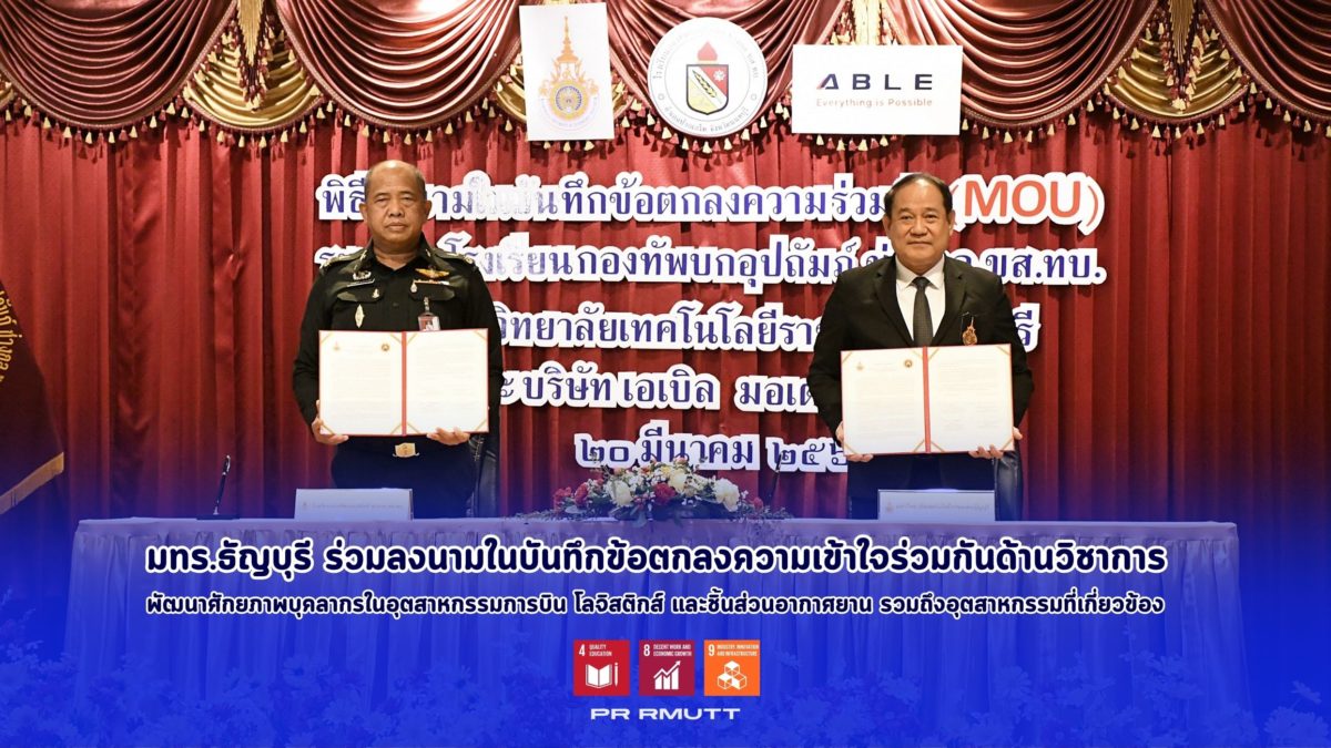 เมื่อวันที่ 20 มีนาคม 2568 ณ ห้องประชุม 1 โรงเรียนกองทัพบกอุปถัมภ์ ช่างกล ขส.ทบ. ได้มีพิธีลงนามบันทึกข้อตกลงความเข้าใจ (MOU) ด้านวิชาการ ระหว่าง รศ.ดร.สมหมาย ผิวสอาด อธิการบดีมหาวิทยาลัยเทคโนโลยีราชมงคลธัญบุรี และ พลตรี นรงฤทธิ์ สุวรรณภักดิ์ เจ้ากรมการขนส่งทหารบก โดยมีเป้าหมายเพื่อพัฒนาศักยภาพบุคลากรในอุตสาหกรรมการบิน โลจิสติกส์ และชิ้นส่วนอากาศยาน รวมถึงอุตสาหกรรมที่เกี่ยวข้องให้มีองค์ความรู้ด้านวิศวกรรมอิเล็กทรอนิกส์อากาศยาน การซ่อมบำรุงอากาศยาน อุตสาหกรรมการบริการการบิน และธุรกิจการบิน ความร่วมมือครั้งนี้สะท้อนถึงความมุ่งมั่นในการยกระดับคุณภาพการศึกษาและการฝึกอบรม เพื่อสร้างบุคลากรที่มีทักษะตรงตามความต้องการของตลาดแรงงานและพร้อมแข่งขันในระดับสากล ตอบโจทย์การพัฒนาอย่างยั่งยืนตามกรอบ เป้าหมายการพัฒนาที่ยั่งยืน (SDGs) โดยเชื่อมโยงกับ SDG 4 การศึกษาที่มีคุณภาพ (เป้าหมายย่อย 4.4) ในการเพิ่มทักษะด้านเทคนิคและอาชีพ, SDG 8 การจ้างงานที่มีคุณค่าและการเติบโตทางเศรษฐกิจ (เป้าหมายย่อย 8.6) ในการลดสัดส่วนเยาวชนที่ไม่มีงานทำหรือการฝึกอบรม และ SDG 9 อุตสาหกรรม นวัตกรรม และโครงสร้างพื้นฐาน (เป้าหมายย่อย 9.5) ในการส่งเสริมการวิจัยและพัฒนาบุคลากรด้านวิทยาศาสตร์และเทคโนโลยี ซึ่งทั้งหมดนี้ถือเป็นการลงทุนในอนาคตของประเทศเพื่อขับเคลื่อนเศรษฐกิจและสร้างความยั่งยืนในอุตสาหกรรมการบินและโลจิสติกส์ของไทย